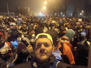 Il est l’heure, l’ouverture des portes pour rejoindre le sas, tout le monde se lève et s’amoncèlent vers nous avec un bruit assourdissant des coureurs qui parlent dû à l’excitation.
