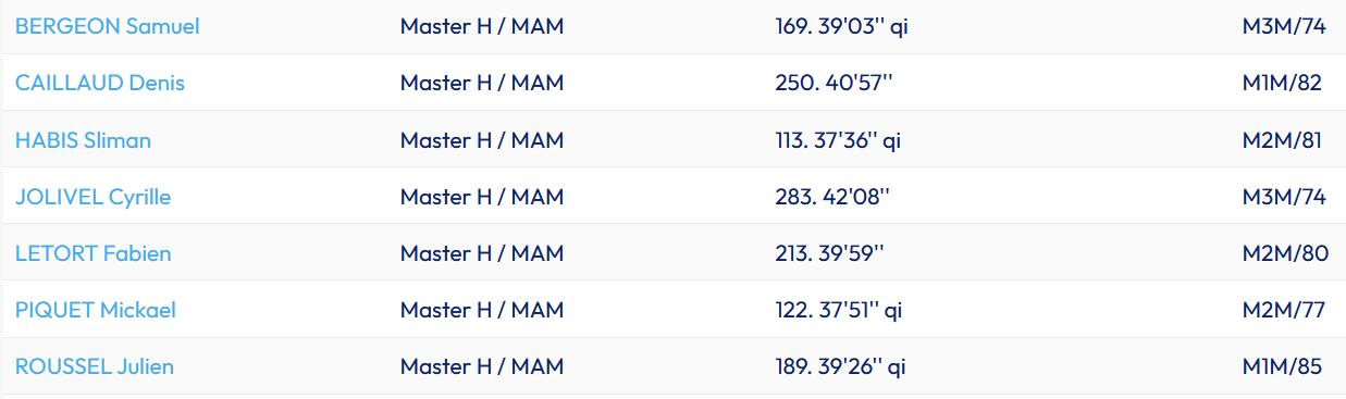 Mention donc à nos masters. Il semble qu’ils soient finalement quatre qualifiés individuels (Sliman Habis, Mickaël Piquet, Samuel Bergeon, Julien Roussel), ce qui au bout du champ nous feras une équipe à Évreux. Dommage que Fabien Letort ait oublié de lacer plus serrées ses chaussures (seul incident du genre de la journée, on progresse !) : nous aurions eu cinq qualifiés… Denis Caillaud et Cyrille Jolivel sont un peu plus loin mais n’ont pas démérité et se sont bien battus. Ils peuvent être fiers de leur parcours.