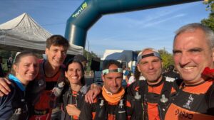C’est un beau petit groupe d’anciens et de nouveaux qui se sont retrouvés à Bourg-des-Comptes pour ce trail de la Courbe. Nullement intéressés par un simple 10 kil’, tant qu’à faire, autant faire le double ! mais la longueur augmente la fatigue et les risques et Kévan l’a appris à ses dépens en y laissant une cheville. Pas trop méchant on l’espère, un peu de repos et ça repartira de plus belle, c’est tout le mal qu’on lui souhaite.