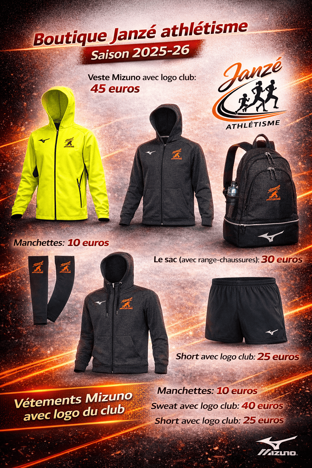La boutique EAC/Janzé athlé Boutique Club 2025-26 Des essayages sont possibles au foyer du stade Le délai de livraison dépend du nombre de commandes, en principe un délai de 1 mois entre le paiement et la livraison (merci pour votre indulgence). Le maillot du club Le port du maillot de Janzé n’est pas obligatoire, il est juste indispensable !!! Du XS au XXL, plusieurs modèles disponibles homme ou femme -Débardeur: 25 euros (ancien modèle: 5 euros) -Brassière: 25 euros -Maillot manches courtes: 30 euros -Maillot trail (col avec zip): 35 euros – Combinaison manches courtes: 60 euros Le maillot de l’EAC Boutique EAC: https://springart.cc/product-category/club/eac/page/2/ Obligatoire pour les catégories jeunes (à partir de benjamins) et les licences compétitions. -Débardeur/brassière: 25 euros (ancien modèle: 5 euros) -Maillot manches courtes: 30 euros Pour toutes informations, commandes ou demandes particulières, n’hésitez pas à contacter Jean-Marie: jmkjouzel@orange.fr