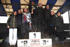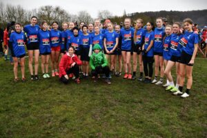 L’équipe là encore est 14e et dernière, loin de ses standards (tout près de la qualif pour rappel l’an passé en cadettes), mais les filles sont toutes 1ère année et ne goûtent guère la boue. Seule Bertille Louaisil a confirmé son superbe hiver de cross et termine de nouveau la première de l’équipe. 63e, elle échoue pour 20″ à se qualifier pour Carhaix (ce qui n’est rien sur 5420m, couverts en 23’29 quand même, ce qui est excellent). Faustine Louaisil n’est pas si loin (81e) mais la qualification était hors de portée. Lucie Gadby est 109e, Léa Robert 110e et Jeanne Richard 113e. Bravo les filles, c’est déjà bien d’être allées jusque-là ! L’an prochain, avec le renfort de Louna, Camille et Juliette (+ Mariama si elle se remet au cross), l’équipe aura belle allure.