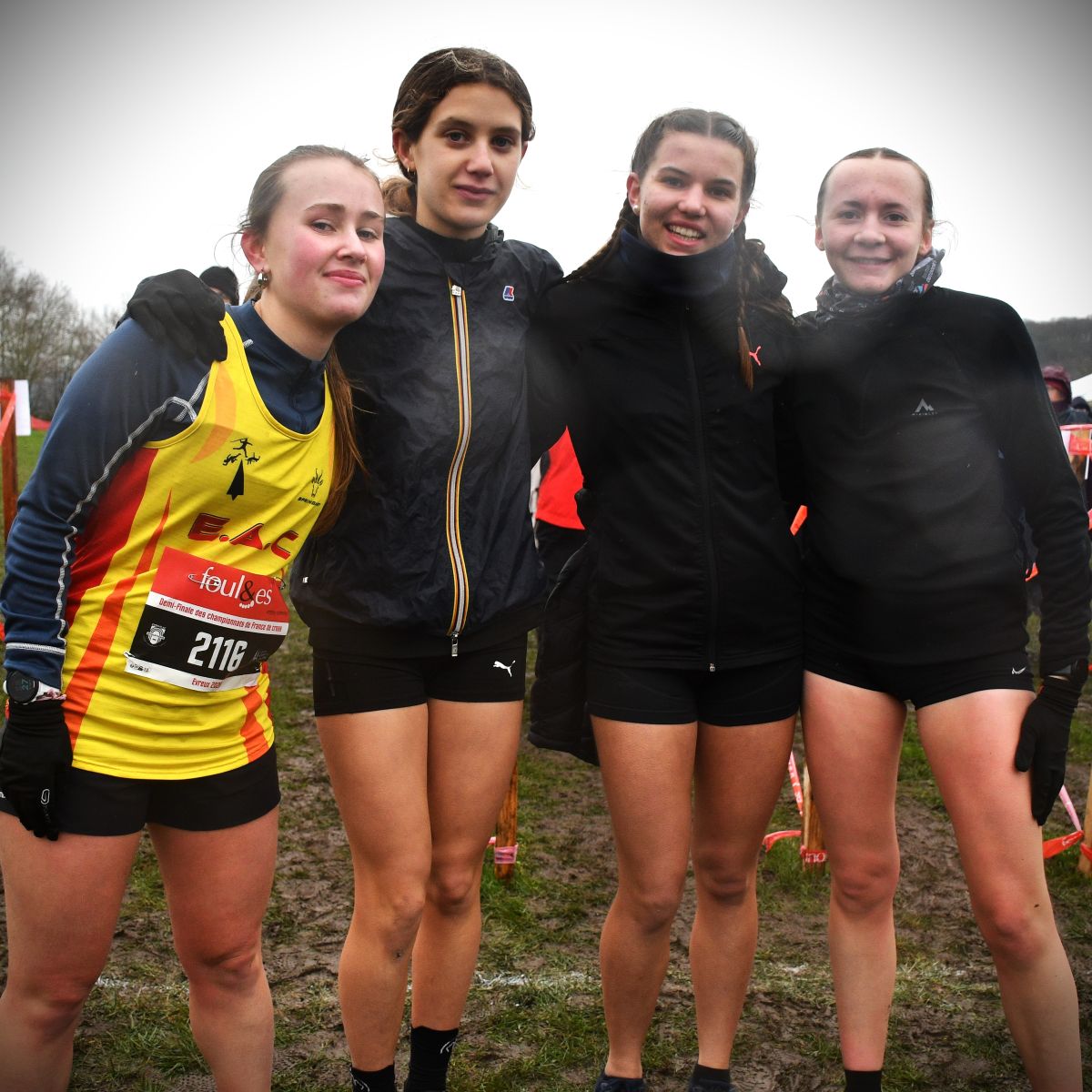 Rose Mahé (Bain) est 4e et gagne avec la sélection 35 le match inter-départements (6e victoire d’affilée pour la sélection 35). Un peu en panne de confiance en cross cet hiver, elle s’est laissée décrocher par les 4 premières, avant de finir en boulet de canon. Nina Rocher de son côté est 44e et fait une très belle course. Elle est 11e du comité 35 (Rose 2e). A noter que Rose perpétue une tradition EAC, puisque Léa Robert et Faustine Louaisil ont gagné deux fois ce match (en 2022 et 2023), et les deux Rose (Mahé et Meyer-Blanchot) en 2025. Nina hélas, en dépit de sa progression depuis Saint-Onen, rate la sélection du Comité 35 pour Carhaix d’un rien.