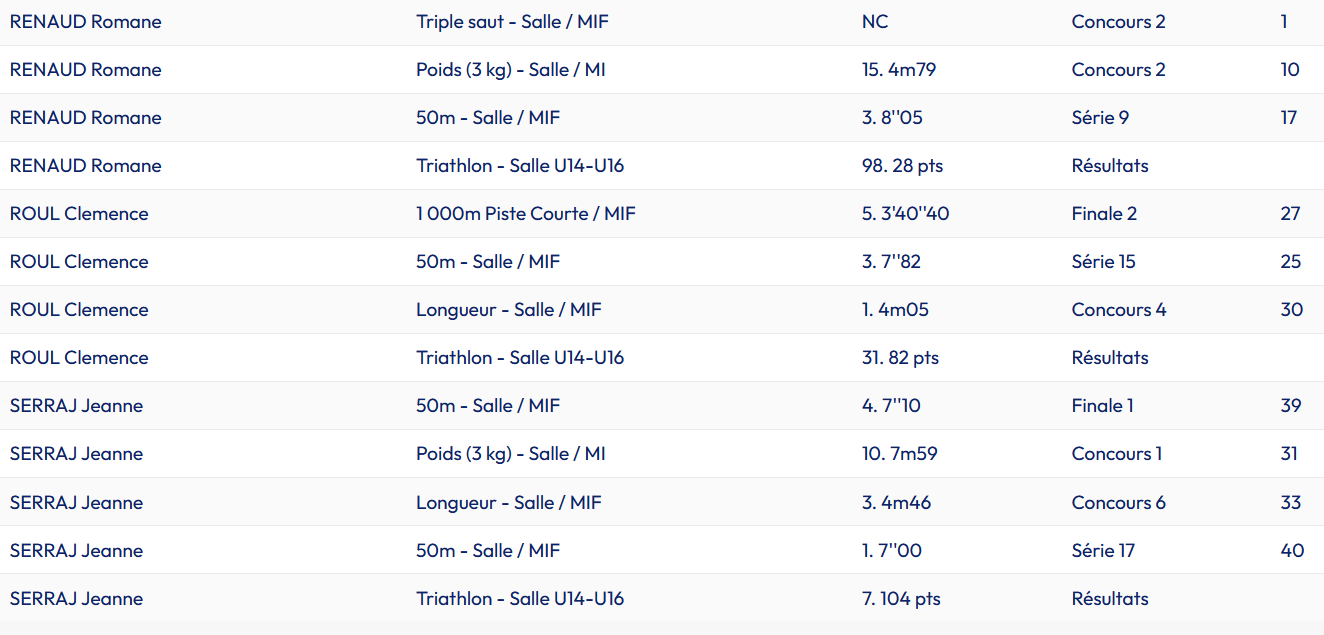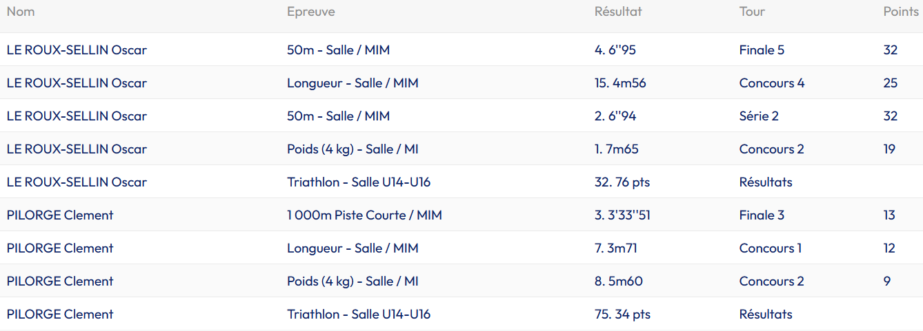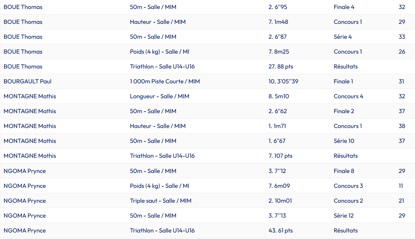 Il gagne le pentathlon (classement sur 5 épreuves) mais également le triathlon (classement sur 3 épreuves / 63 classés), avec des totaux jamais atteints dans l’histoire du club : 192 points au pentathlon et 123 au triathlon. C’est brillant ! Il a juste un (petit) point faible au poids (mais 7m62 quand même) et dans une moindre mesure au triple saut (9m91), mais excelle sur 50m (6″96), sur 50m haies (8″00) et en hauteur (1m55). Il fait encore mieux qu’à Robert-Poirier le 10 janvier, où il avait portant déjà excellé sur le pentathlon (1er avec 188 points).