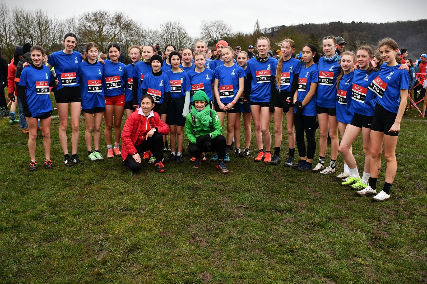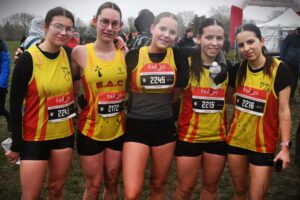 L’équipe là encore est 14e et dernière, loin de ses standards (tout près de la qualif pour rappel l’an passé en cadettes), mais les filles sont toutes 1ère année et ne goûtent guère la boue. Seule Bertille Louaisil a confirmé son superbe hiver de cross et termine de nouveau la première de l’équipe. 63e, elle échoue pour 20″ à se qualifier pour Carhaix (ce qui n’est rien sur 5420m, couverts en 23’29 quand même, ce qui est excellent). Faustine Louaisil n’est pas si loin (81e) mais la qualification était hors de portée. Lucie Gadby est 109e, Léa Robert 110e et Jeanne Richard 113e. Bravo les filles, c’est déjà bien d’être allées jusque-là ! L’an prochain, avec le renfort de Louna, Camille et Juliette (+ Mariama si elle se remet au cross), l’équipe aura belle allure.