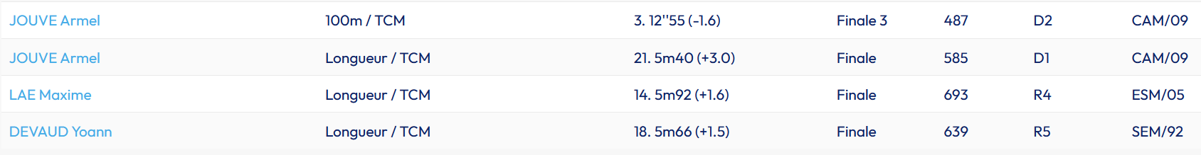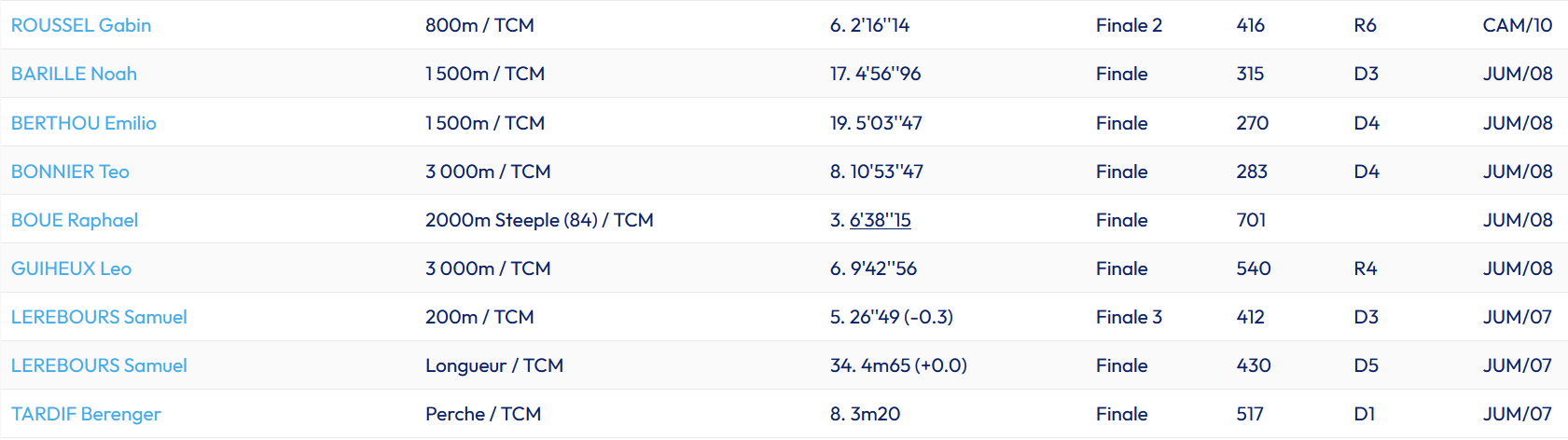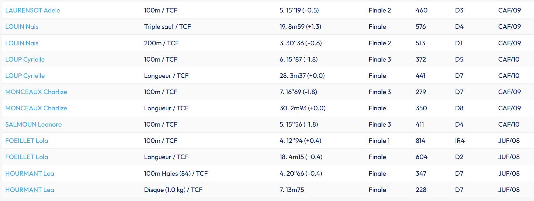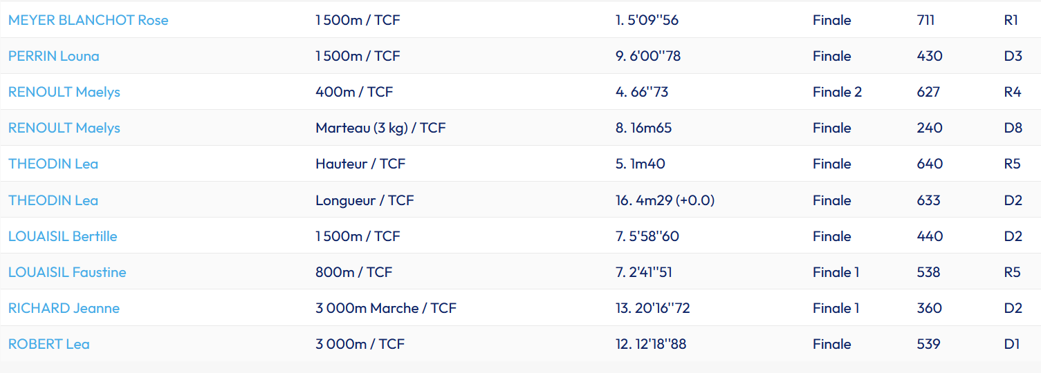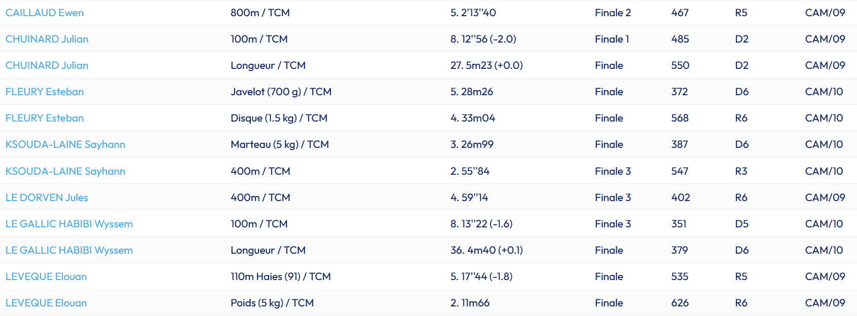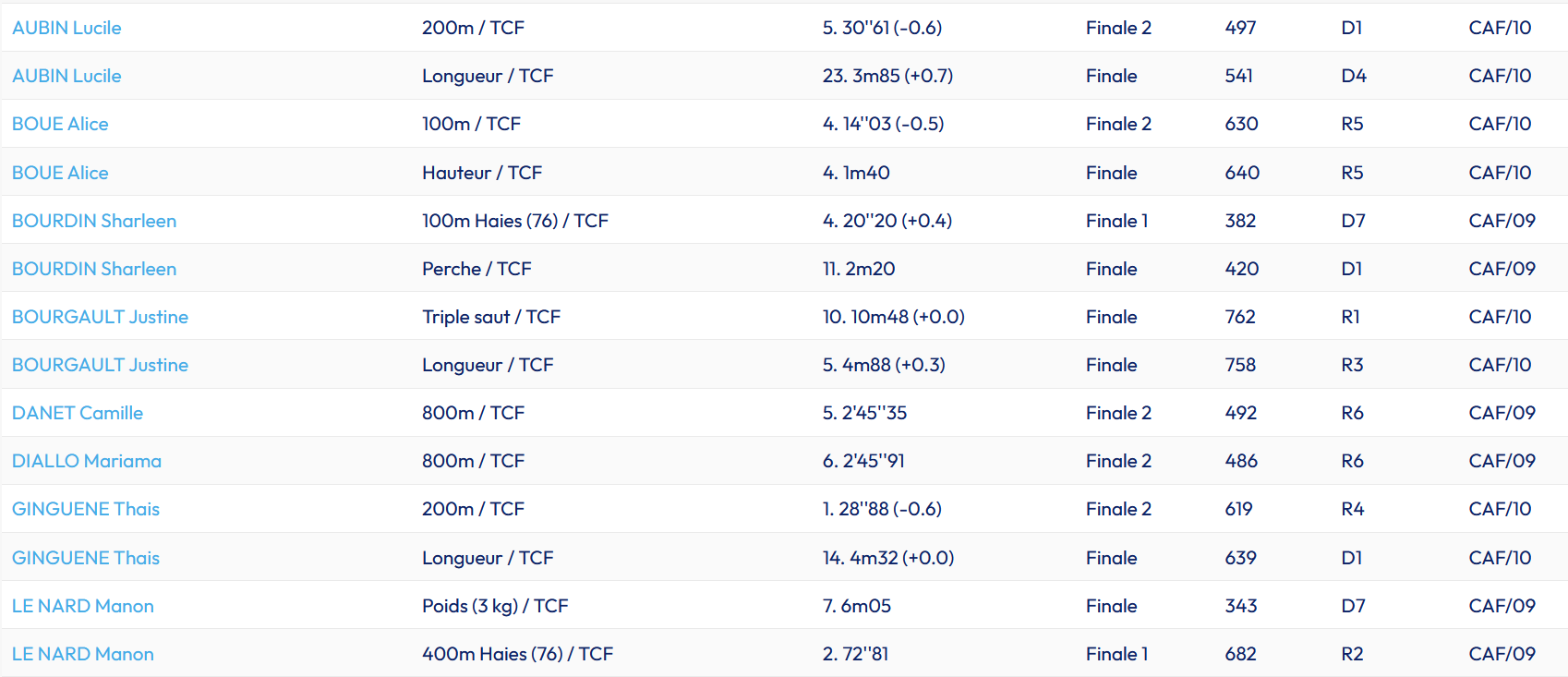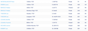 A noter 21 perfs d’un niveau au moins régional sur les 61 perfs individuelles enregistrées (hors relais). C’est un bon résultat pour un mois de septembre. Au final, le CJF Saint-Malo, double champion de France en titre, sort vainqueur de la poule, avec 12 498 points et sera encore l’une des équipes favorites à Saint-Renan, l’EA Pays de Brocéliande est 2e, avec 11 986 points, et l’EAC (janzéenne aux 4/5e) est 3e, avec 11 543 points. Nous laissons l’AC Locminé-Pontivy 1000 points derrière. Bravo à toutes et tous !