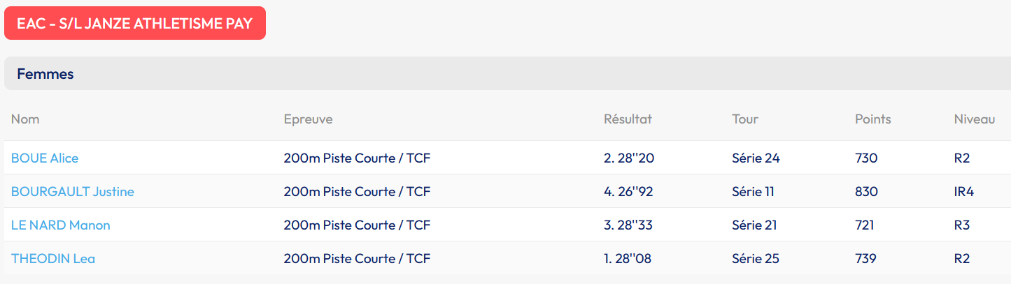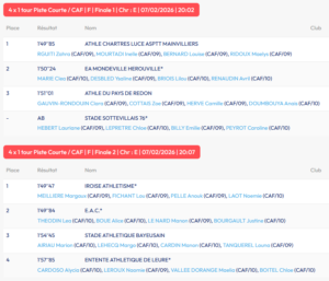 Une seconde de gagnée tous les quinze jours ! A ce rythme, on est pressé de voir arriver le 7 mars. On savait notre relais cadettes costaud, avec en plus six filles quasi interchangeables (Léa Théodin, Alice Boué, Manon Le Nard, Justine Bourgault, Thaïs Ginguené et Maëlys Renoult) et deux autres à l’affut (Lucile Aubin et Sharleen Bourdin), mais elles ont prouvé ce samedi 7 février qu’elles avaient du répondant, y compris au plus haut niveau, n’étant battues que de 37 centièmes par l’iroise Athlé.