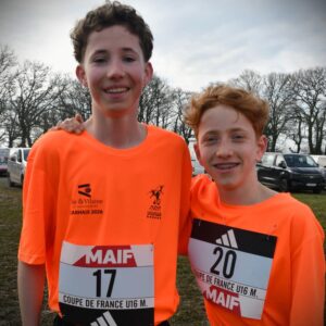 Ils avaient fait tous les deux le voyage de la neige, dans la semaine précédant celle de Carhaix, mais n’en sont pas revenus avec les mêmes dispositions. Lucas Guiheux, ressourcé, y a trouvé l’occasion de se relancer. Pour Paul Bourgault, la redescente a été plus difficile et l’heure aurait dû être plutôt au repos. Ils sont allés au bout de leurs forces néanmoins, et, dans ce contexte hyper relevé, c’était déjà très bien. Lucas est un bon 93e, à 2’25 du 1er (ce qui n’est pas si mal sur 4 658m), et Paul est 125e (sur 131 classés). Leur équipe d’Ille-et-Vilaine est 17e (sur 19 classées). Bravo en tout cas à tous les deux pour ce bel hiver de cross. Lucas en particulier a passé un cap notable. A Carhaix, il finit 6e Brétillien, la même place qu’à Saint-Onen La Chapelle. Vous notez les maillots orange : le CDA 35 a rendu hommage à Janzé Athlé !