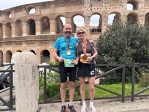 Venue pour accompagner un ami, le chrono n’était pas sa priorité et parfois, ça fait du bien ! pas de classement car elle était inscrite en Pacer, c’est-à-dire en mode lièvre. Malgré tout, une balade dans la ville éternelle doit valoir son pesant de sesterces ! qu’importe le classement:  » Courir pour un ami, coach et lièvre à la fois, il n’y a rien de plus beau. Une promesse de très longue date (14 ans) et nous voilà enfin ensemble sur le marathon de Rome ce matin. Quel beau parcours, chargé d’histoire et la ligne d’arrivée comme une délivrance pour Mickael, que du bonheur. Une belle médaille. Récupération avant bientôt un 100km. »